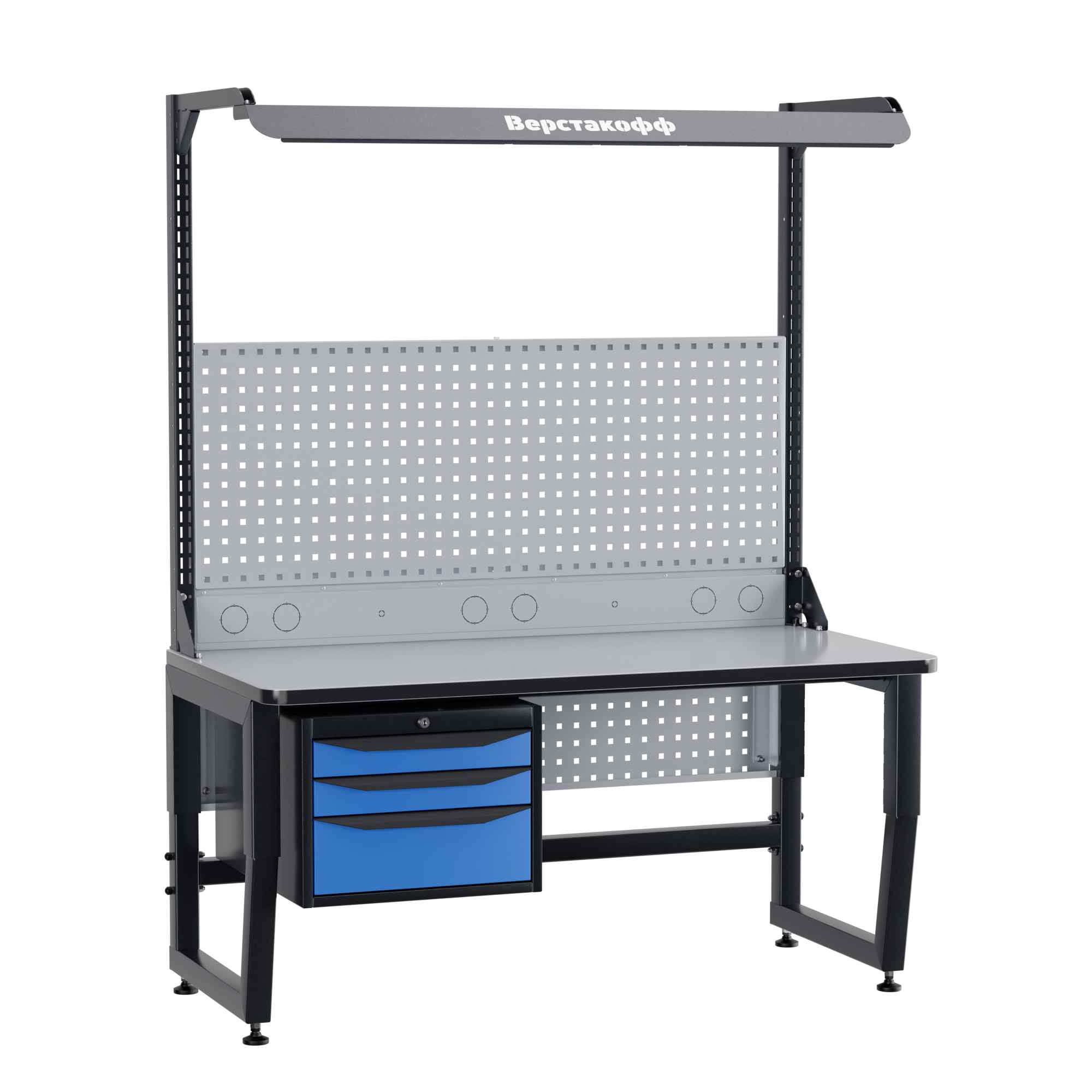 Для наилучшей освещенности при работе с мелкими электронными компонентами рабочее место комплектуется блоком освещения. В его составе - специальный промышленный светильник с необходимой  цветовой температурой и световым потоком, обеспечивающим оптимальные условия работы. Блок освещения располагается над рабочей поверхностью на регулируемых (по высоте и по вылету) кронштейнах