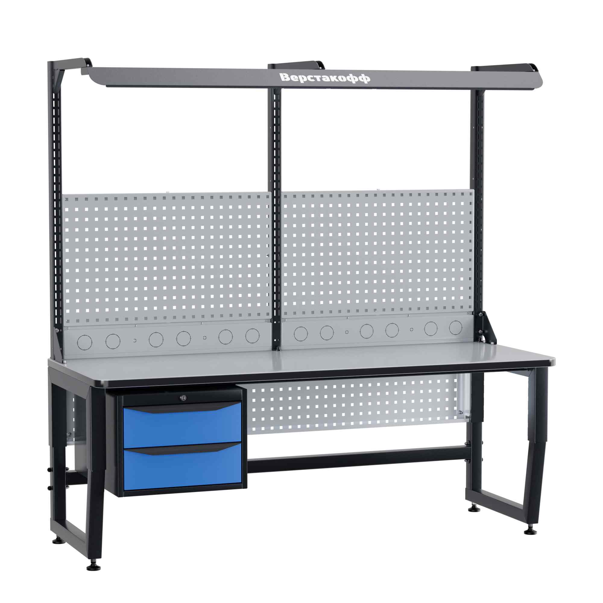 Для наилучшей освещенности при работе с мелкими электронными компонентами рабочее место комплектуется блоком освещения. В его составе - специальный промышленный светильник с необходимой  цветовой температурой и световым потоком, обеспечивающим оптимальные условия работы. Блок освещения располагается над рабочей поверхностью на регулируемых (по высоте и по вылету) кронштейнах