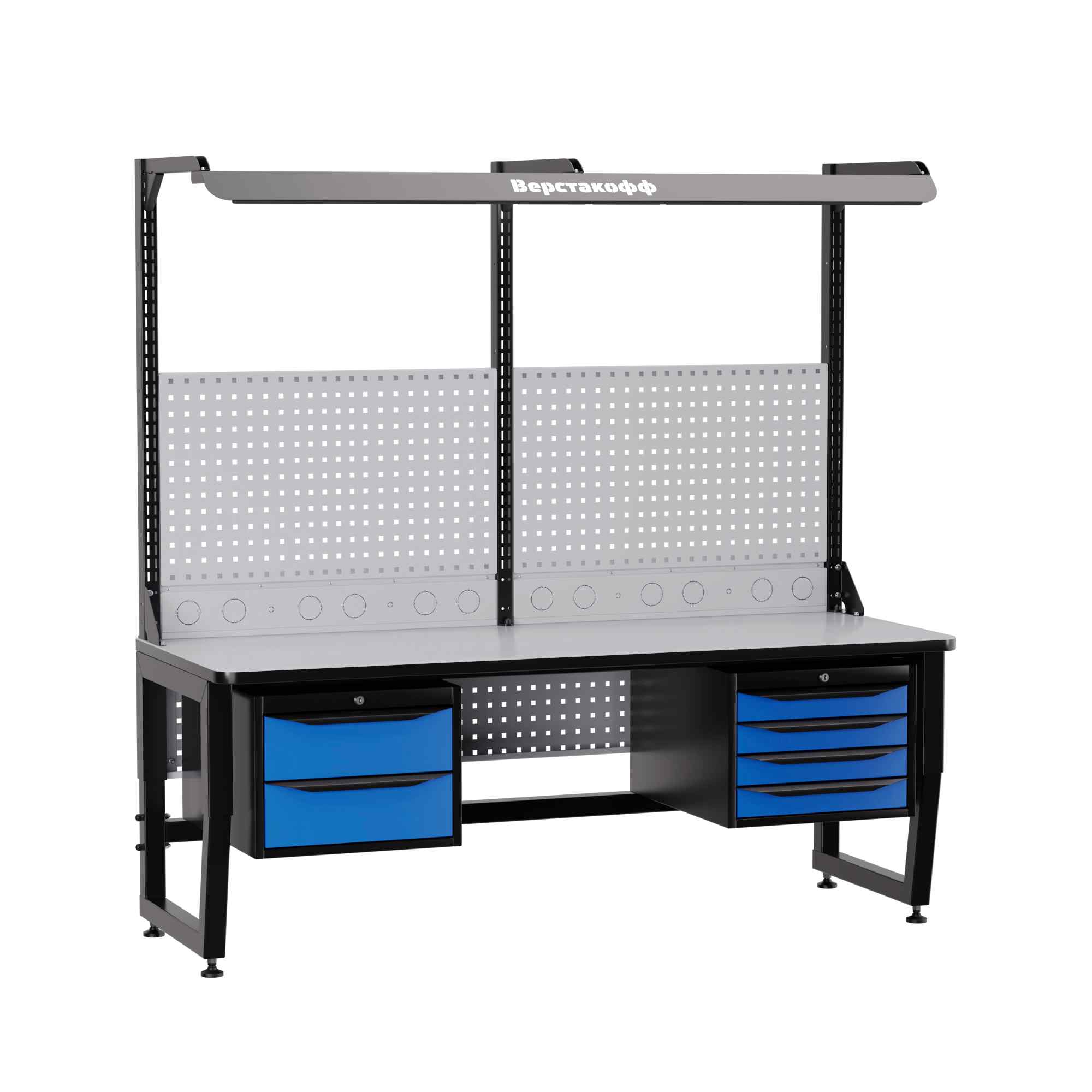 Для наилучшей освещенности при работе с мелкими электронными компонентами рабочее место комплектуется блоком освещения. В его составе - специальный промышленный светильник с необходимой  цветовой температурой и световым потоком, обеспечивающим оптимальные условия работы. Блок освещения располагается над рабочей поверхностью на регулируемых (по высоте и по вылету) кронштейнах