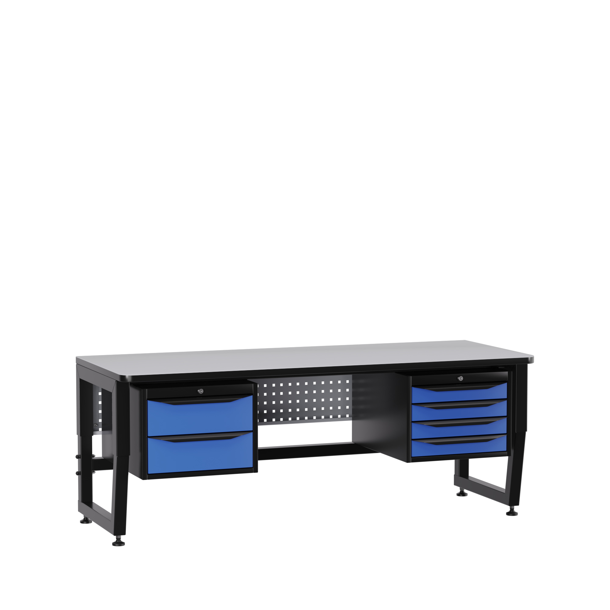 Несущая конструкция стола – это промышленный ESD каркас. Сочетание опорных, несущих и усиливающих элементов из металла, обеспечивают высокую надежность конструкции при интенсивной промышленной эксплуатации с распределенными нагрузками на рабочее место до 500 кг.  Регулируемые опоры с возможностью плавной регулировки по высоте позволяют установить удобную высоту рабочей поверхности от 700мм до 850мм. Специальное ESD полимерное покрытие элементов каркаса с  сопротивлением 1 МОм обеспечивают антистатические свойства изделия