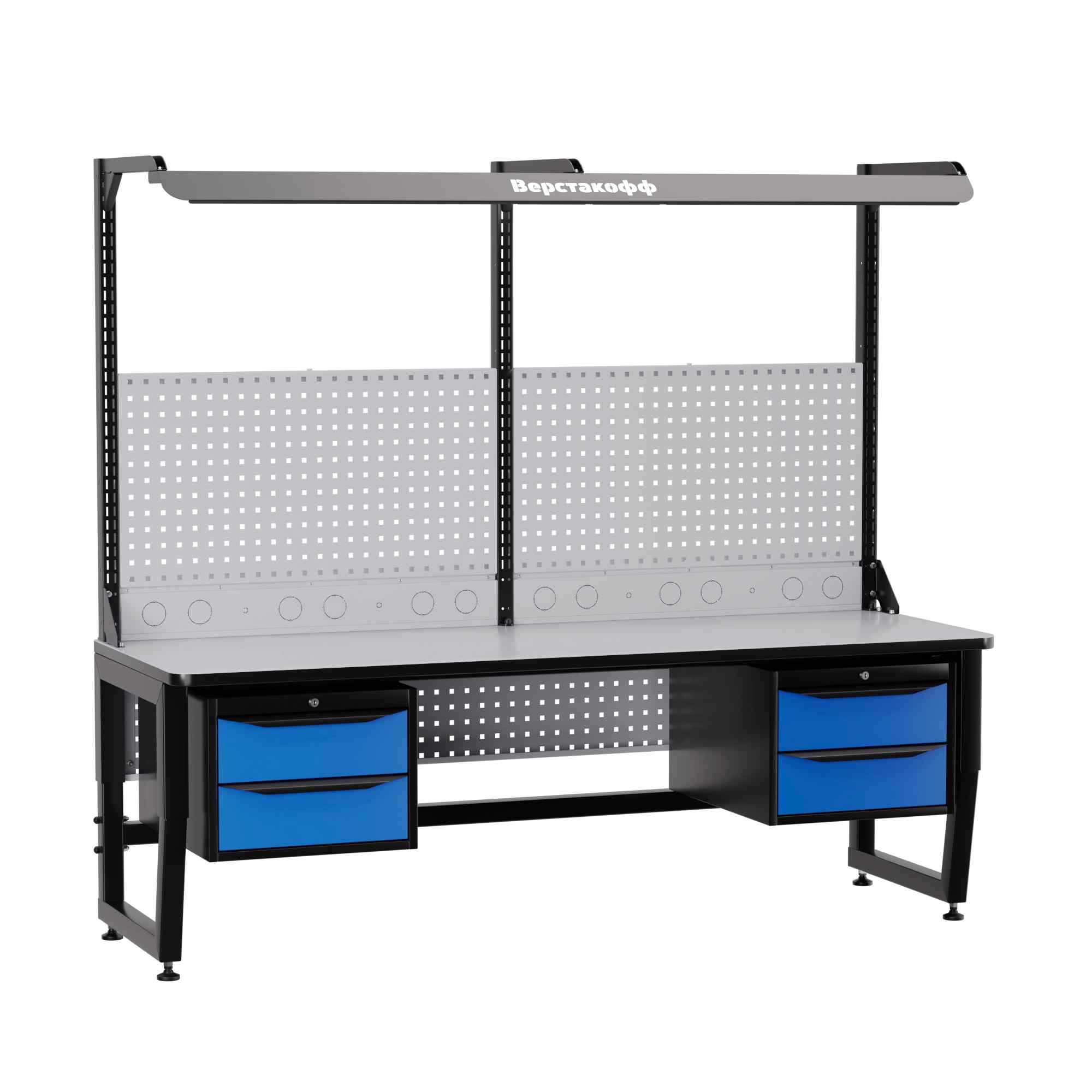 Для наилучшей освещенности при работе с мелкими электронными компонентами рабочее место комплектуется блоком освещения. В его составе - специальный промышленный светильник с необходимой  цветовой температурой и световым потоком, обеспечивающим оптимальные условия работы. Блок освещения располагается над рабочей поверхностью на регулируемых (по высоте и по вылету) кронштейнах