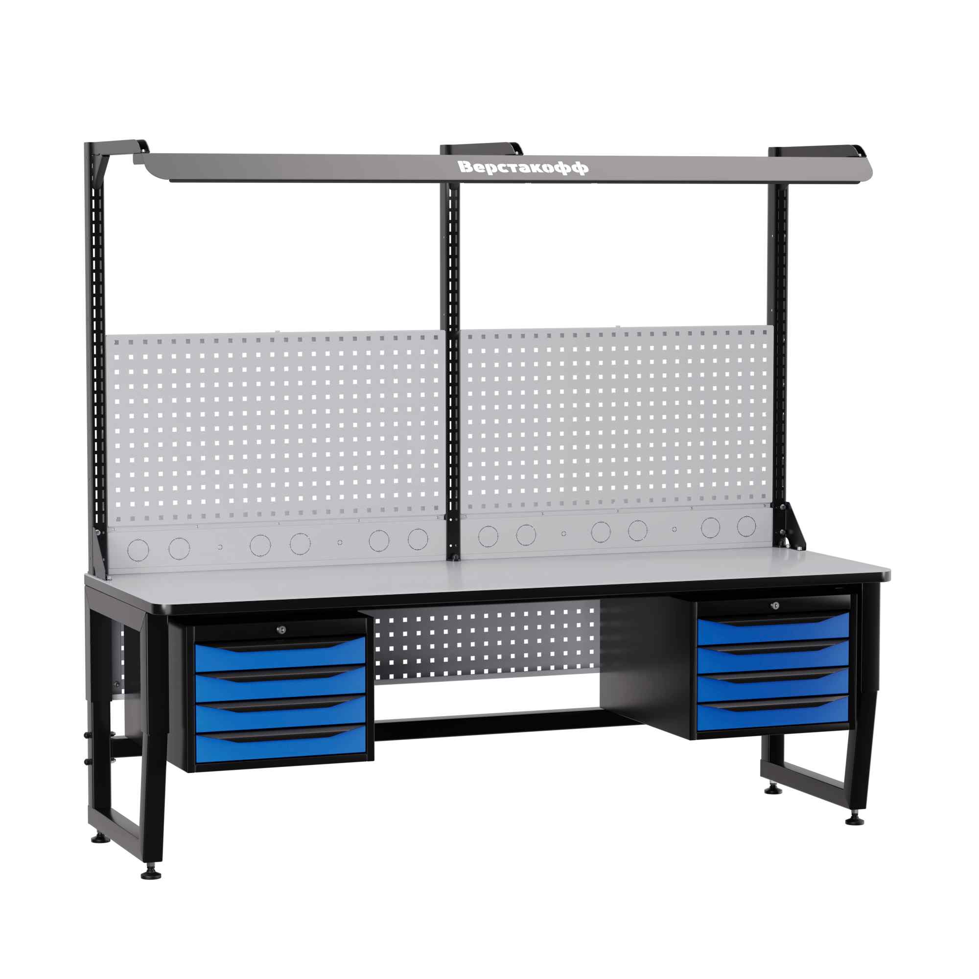 Для наилучшей освещенности при работе с мелкими электронными компонентами рабочее место комплектуется блоком освещения. В его составе - специальный промышленный светильник с необходимой  цветовой температурой и световым потоком, обеспечивающим оптимальные условия работы. Блок освещения располагается над рабочей поверхностью на регулируемых (по высоте и по вылету) кронштейнах