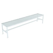В скамейках в качестве сиденья используется цельный лист с перфорацией RV (круги в шахматном порядке). Под заказ возможно изготовление любой перфорации или рисунка. Под заказ сиденье может быть из нержавеющей стали или алюминия. Скамейки имеют полностью сварной каркас, изготовленный из профильной трубы 25х25 мм. Данные скамейки окрашиваются порошковой полиэфирной краской, для уличного использования. Стандартные цвет: RAL 7035. Текстура - шагрень.