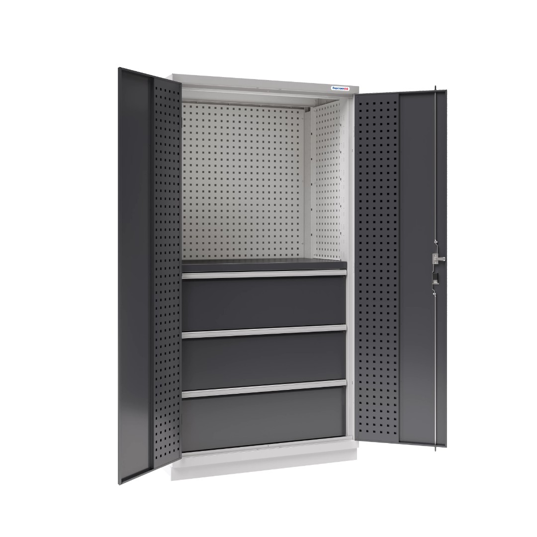 Шкаф инструментальный Fabrik тяжёлой серии представляет собой сборно-разборную конструкцию, предназначен для хранения оснастки, приспособлений и инструмента в мастерских, цехах и других производственных зонах. Шкаф изготовлен из листовой стали и обеспечивает надежное запирание дверей ригельной системой.