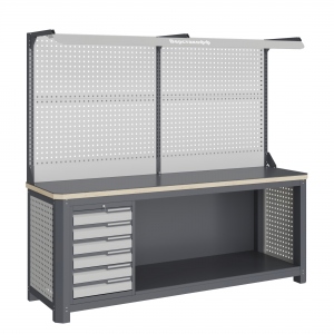 Верстак серии MECHANIC: MCN 2052.S6.111-2F состоит из столешницы шириной 1993 мм, рамы верстака, состоящей из опор, перемычек, боковых перфопанелей, малого модуля S6 и трех комплектов полка-стенка SW1, двойного экрана с кронштейнами и комплектом освещения.