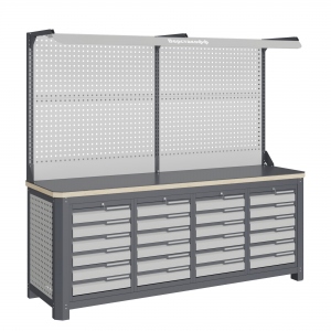 Верстак серии MECHANIC: MCN 2052.S6666-2F состоит из столешницы шириной 1993 мм, рамы верстака, состоящей из опор, перемычек, боковых перфопанелей, четырех малых модулей S6, двойного экрана с кронштейнами и комплекта освещения.
