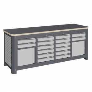 Верстак серии MECHANIC: MCN 2052.S6699 состоит из столешницы шириной 1993 мм, рамы верстака, состоящей из опор, перемычек, боковых перфопанелей, малых модулей S6 и S9.
