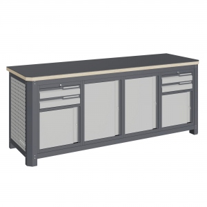 Верстак серии MECHANIC: MCN 2052.S7799 состоит из столешницы шириной 1993 мм, рамы верстака, состоящей из опор, перемычек, боковых перфопанелей, малых модулей S7 и S9.