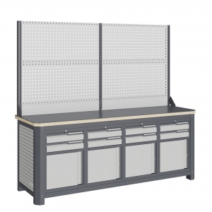 Верстак серии MECHANIC: MCN 2052.S9999-2 состоит из столешницы шириной 1993 мм, рамы верстака, состоящей из опор, перемычек, боковых перфопанелей, четырех малых модулей S9, двойного экрана с кронштейнами.