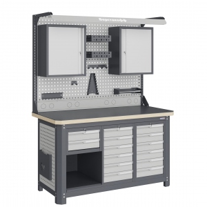 Рабочее место MECHANIC: MCN 1552.S2689-2FR состоит из столешницы шириной 1493 мм, рамы верстака, состоящей из опор, перемычек, боковых перфопанелей, двух малых модулей S6 и модуля S2 c комплектом полка-стенка SW2, двойного экрана с кронштейнами, комплекта освещения и блока коммуникаций.