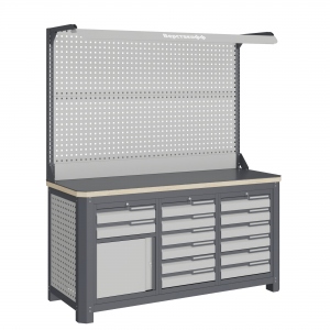 Верстак серии MECHANIC: MCN 1552.S69.1 состоит из столешницы шириной 1493 мм, рамы верстака, состоящей из опор, перемычек, боковых перфопанелей, малых модулей S6 и S9, комплекта полка-стенка SW1.