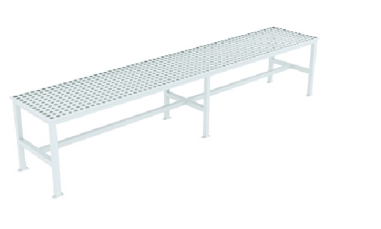 В скамейках   в качестве сиденья используется цельный лист с перфорацией RV (круги в шахматном порядке). Под заказ возможно изготовление любой перфорации или рисунка. Под заказ сиденье может быть из нержавеющей стали или алюминия. Скамейки имеют полностью сварной каркас, изготовленный из профильной трубы 25х25 мм.      Данные скамейки окрашиваются порошковой полиэфирной краской, для уличного использования. Стандартные цвет: RAL 7035. Текстура - шагрень.
