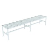 В скамейках   в качестве сиденья используется цельный лист с перфорацией RV (круги в шахматном порядке). Под заказ возможно изготовление любой перфорации или рисунка. Под заказ сиденье может быть из нержавеющей стали или алюминия. Скамейки имеют полностью сварной каркас, изготовленный из профильной трубы 25х25 мм.      Данные скамейки окрашиваются порошковой полиэфирной краской, для уличного использования. Стандартные цвет: RAL 7035. Текстура - шагрень.