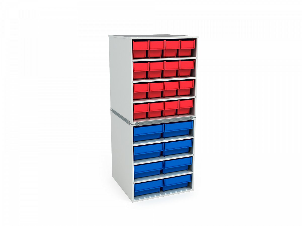 Стационарная кассетница собирается из Кассеты К-01/1 и Кассеты К-01/2. Кассета К-01/1 — в комплекте 8 ящиков серии Б 400х185х100 на 7 литров каждый, Кассета К-01/2 — в комплекте 16 ящиков серии Б 400х92х100 на 3,5 литров каждый.