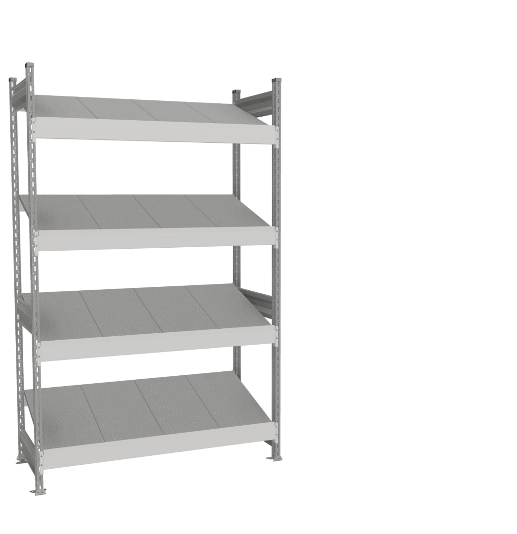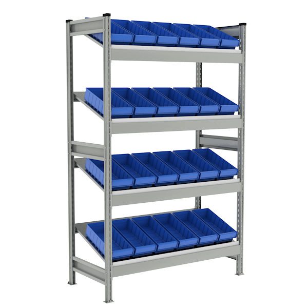 Предназначен для хранения различных мелких грузов в пластиковых ящиках, установленных на наклонные ярусы хранения.