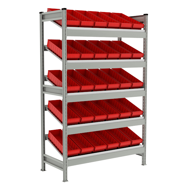 Предназначен для хранения различных мелких грузов в пластиковых ящиках, установленных на наклонные ярусы хранения.