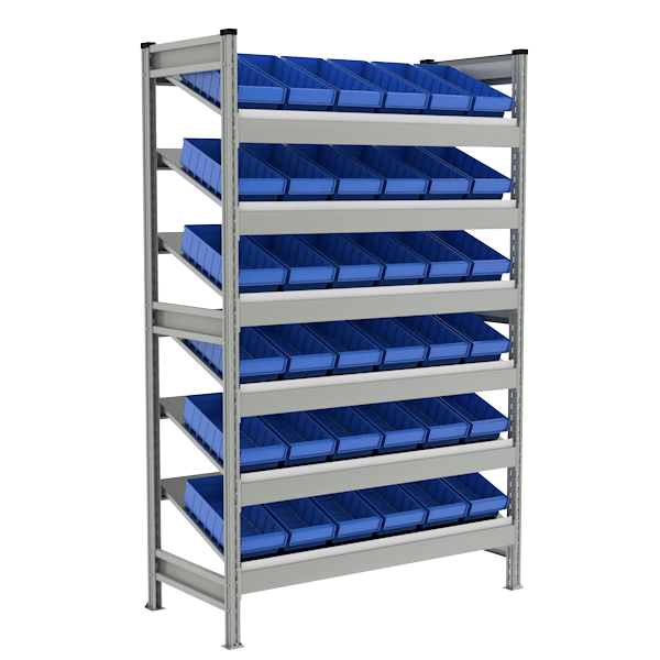 Предназначен для хранения различных мелких грузов в пластиковых ящиках, установленных на наклонные ярусы хранения.