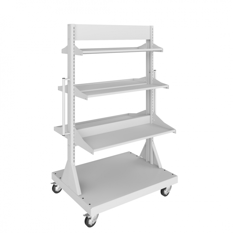 Стойка на базе платформы Mobiler оснащена двумя навесными полками SP401 с допустимой нагрузкой до 30 кг, двумя навесными полками SP402 с допустимой нагрузкой до 40 кг и вумя навесными полками SP403 с допустимой нагрузкой до 50 кг для размещения, хранения и перемещения инструментов и приспособлений как использованием пластиковых контейнеров, так и бех них.