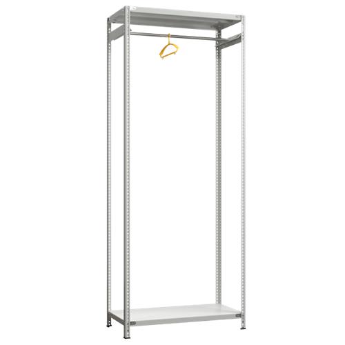 • Состоит из 4 стоек с перфорацией, 2 полок и одного яруса-вешала со штангой для одежды на плечиках.