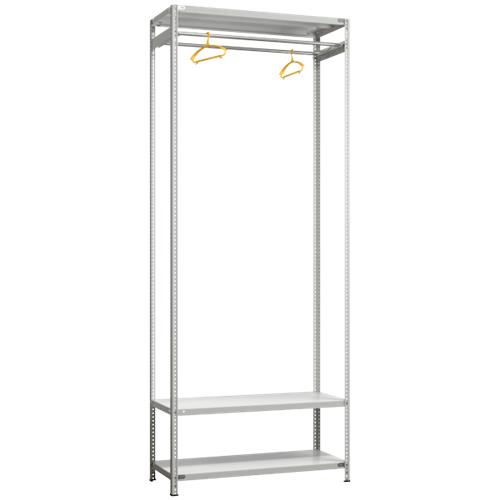 • Конструкция состоит из трёх полок и одного яруса с двумя штангами для плечиков с одеждой.