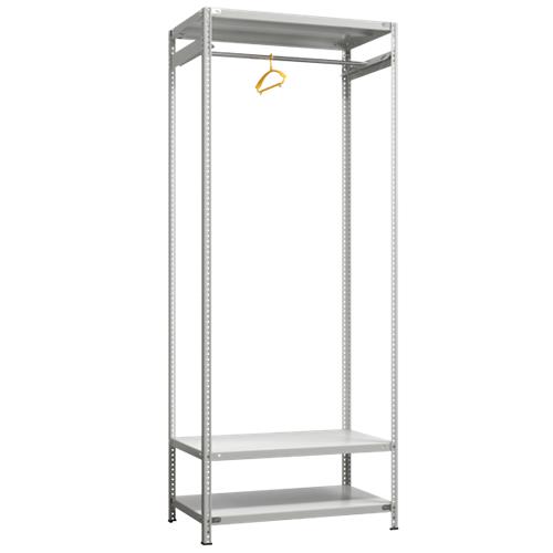 • Состоит из четырёх стоек с перфорацией, трёх полок и одного яруса-вешала со штангой для плечиков с одеждой.