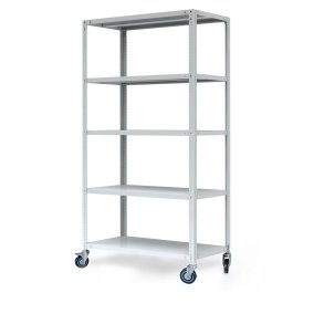 Полки регулируются по высоте с шагом 25 мм. Стойки укомплектованы металлическими кронштейнами (цинк) и 4 колеса (2 из которых поворотные, а 2 не поворотные с тормозом).