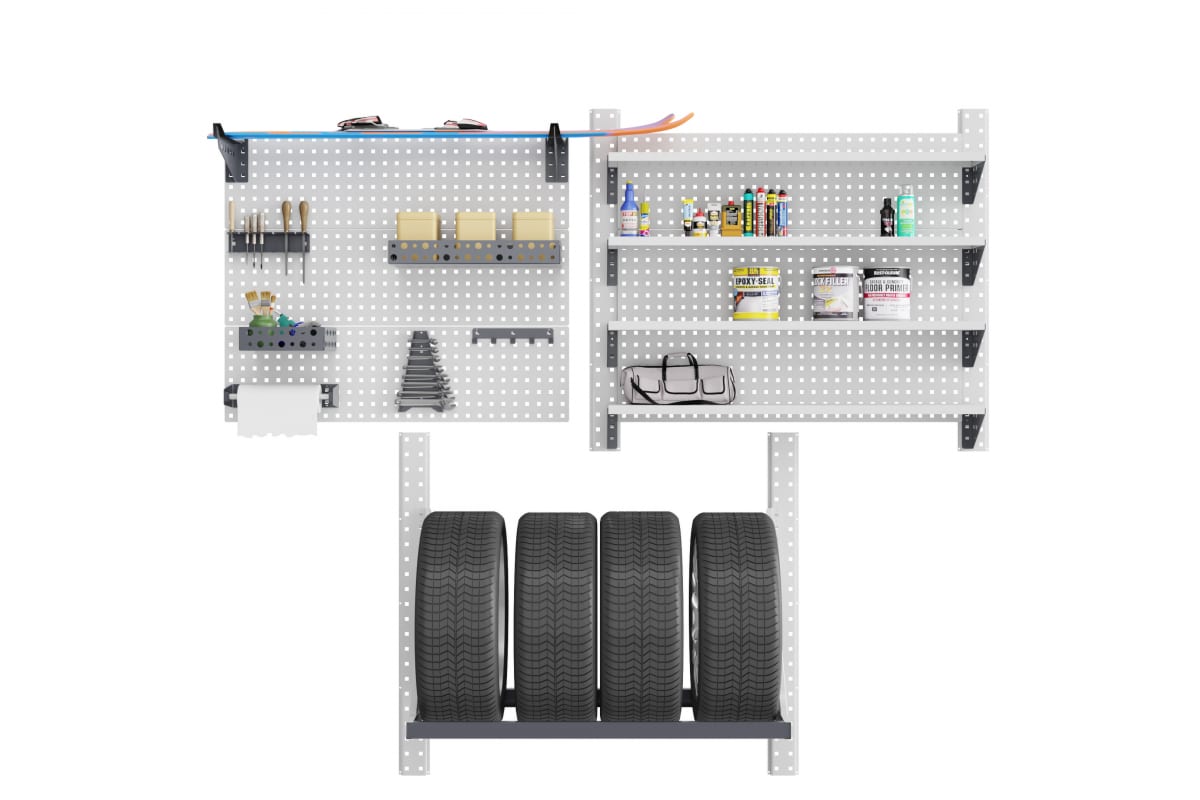 Система хранения Quadro поможет вам организовать хранение шин, велосипедов, лыж, садовых и рабочих инструментов оптимально используя пространство гаража. Комплект состоит из 3-х модулей. 1 модуль - 3 перфорированных панели, 2 держателя, 2 лотка, 1 держатель для отверток, 1 держатель для ключей, 1 держатель для полотенец, 1 вешалка. Размеры В- 906хШ-1101хГ-305. 2-й-модуль - 2 перфорированных профиля и 4 навесных полок. Размеры модуля В- 906хШ-1301хГ-305. 3-й модуль - хранение колес 2 перфорированных профиля и 1 полка для колес. Размеры модуля В-1101хШ-1174хГ-605.