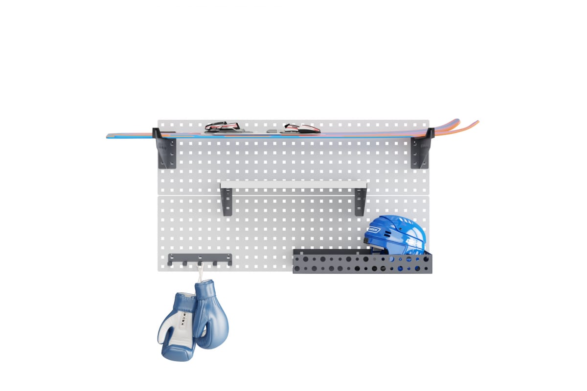 Комплект состоит из 2-х перфорированных панелей, размещеных горизонтально, 2 держателя, 1 лоток, 1 полка навесная, 1 вешалка. Размеры  В-604хШ-1101хГ-305. Есть возможность моделировать пространство по собственному усмотрению.