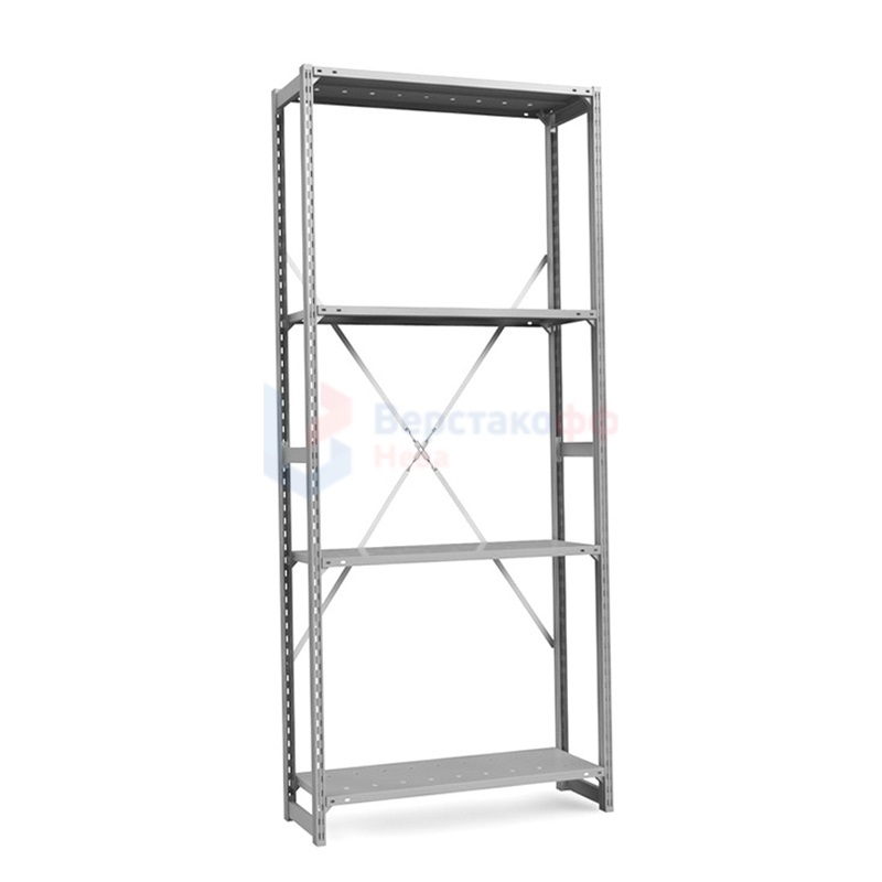 Стеллаж комплектуется сплошными металлическими полками, покрыт порошковой полимерной краской светло-серого цвета (RAL 7035).