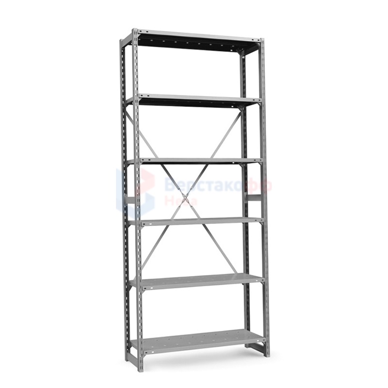 Стеллаж комплектуется сплошными металлическими полками, покрыт порошковой полимерной краской светло-серого цвета (RAL 7035).