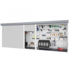 Трёхсекционные роллетные шкафы представляют собой сборно-разборную конструкцию, состоящую из набора панелей, двух соеденительных рам и трёх комплектов рольставней, которые соединяются между собой при помощи винтового соединения с внутренней части шкафа. Рольставни могут иметь различные размеры по ширине, в зависимости от требований. Составные панели выполнены из конструкционной листовой оцинкованной стали ГОСТ 14918 толщиной 1.0мм. Составные элементы окрашены порошковой краской, стандартный цвет RAL 5005 окраска, дополнительно защищает элементы шкафа и придаёт необходимый вид (рольставни стандартно окрашиваются в светло-серый цвет, возможность изменения цвета рольставней по запросу). Шкаф предназначен для хранения различных вещей и инструмента, устанавливается в крытых помещениях, паркингах или под навесом на прочную поверхность (бетонная или деревянная поверхность). В шкаф дополнительно можно установить стеллажи, на боковые и заднюю стенки перфорированные панели (для установки нассных удерживающих элементов), различные полки, в нижнюю часть шкафа пол в виде настилов (набор планок). Устанавливаемые рольставни могут быть как стандартные так и усиленные.