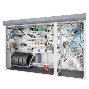 Двухсекционные роллетные шкафы представляют собой сборно-разборную конструкцию, состоящую из набора панелей, соеденительной рамы и двух комплектов рольставней, которые соединяются между собой при помощи винтового соединения с внутренней части шкафа. Рольставни могут иметь различные размеры по ширине, в зависимости от требований. Составные панели выполнены из конструкционной листовой оцинкованной стали ГОСТ 14918 толщиной 1.0мм. Составные элементы окрашены порошковой краской, окраска дополнительно защищает элементы шкафа и придаёт необходимый вид (рольставни стандартно окрашиваются в светло-серый цвет, стандартный цвет RAL 5005, возможность изменения цвета рольставней по запросу). Шкаф предназначен для хранения различных вещей и инструмента, устанавливается в крытых помещениях, паркингах или под навесом на прочную поверхность (бетонная или деревянная поверхность). В шкаф дополнительно можно установить стеллажи, на боковые и заднюю стенки перфорированные панели (для установки нассных удерживающих элементов), различные полки, в нижнюю часть шкафа пол в виде настилов (набор планок). Устанавливаемые рольставни могут быть как стандартные так и усиленные.