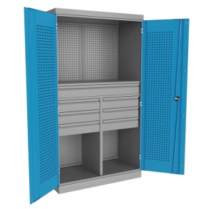 Шкаф инструментальный серии «PRF» предназначен для хранения оснастки, приспособлений и инструмента на рабочих местах в мастерских, цехах и других производственных зонах. Шкаф изготовлен из листовой стали и обеспечивает надежное запирание дверей ригельной системой. Шкаф данной модели может комплектоваться либо полками PRF(1) и ящиками PRF(1) – по всей ширине шкафа, при этом максимальное количество полок и ящиков по высоте - 13 штук. При установке перегородки, шкаф делится на две части и может комплектоваться полками PRF(2) и ящиками PRF(2), при этом максимальное количество полок и ящиков по высоте - 13 штук в два ряда.
