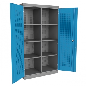 Шкаф инструментальный серии «PRF» предназначен для хранения оснастки, приспособлений и инструмента на рабочих местах в мастерских, цехах и других производственных зонах. Шкаф изготовлен из листовой стали и обеспечивает надежное запирание дверей ригельной системой. Шкаф данной модели может комплектоваться либо полками PRF(1) и ящиками PRF(1) – по всей ширине шкафа, при этом максимальное количество полок и ящиков по высоте - 13 штук. При установке перегородки, шкаф делится на две части и может комплектоваться полками PRF(2) и ящиками PRF(2), при этом максимальное количество полок и ящиков по высоте - 13 штук в два ряда.