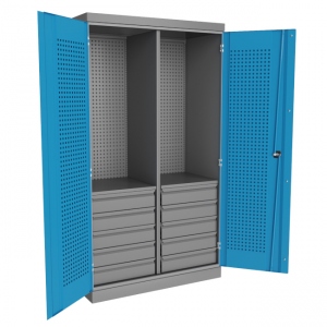 Шкаф инструментальный серии «PRF» предназначен для хранения оснастки, приспособлений и инструмента на рабочих местах в мастерских, цехах и других производственных зонах. Шкаф изготовлен из листовой стали и обеспечивает надежное запирание дверей ригельной системой. Шкаф данной модели может комплектоваться либо полками PRF(1) и ящиками PRF(1) – по всей ширине шкафа, при этом максимальное количество полок и ящиков по высоте - 13 штук. При установке перегородки, шкаф делится на две части и может комплектоваться полками PRF(2) и ящиками PRF(2), при этом максимальное количество полок и ящиков по высоте - 13 штук в два ряда.