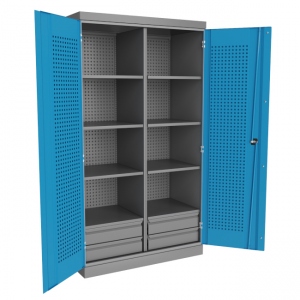 Шкаф инструментальный серии «PRF» предназначен для хранения оснастки, приспособлений и инструмента на рабочих местах в мастерских, цехах и других производственных зонах. Шкаф изготовлен из листовой стали и обеспечивает надежное запирание дверей ригельной системой. Шкаф данной модели может комплектоваться либо полками PRF(1) и ящиками PRF(1) – по всей ширине шкафа, при этом максимальное количество полок и ящиков по высоте - 13 штук. При установке перегородки, шкаф делится на две части и может комплектоваться полками PRF(2) и ящиками PRF(2), при этом максимальное количество полок и ящиков по высоте - 13 штук в два ряда.