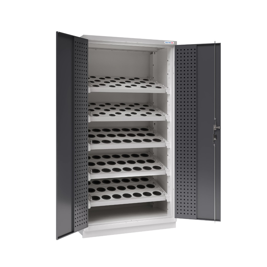 Шкаф инструментальный Fabrik тяжёлой серии представляет собой сборно-разборную конструкцию, предназначен для хранения оснастки, приспособлений и инструмента в мастерских, цехах и других производственных зонах. Шкаф изготовлен из листовой стали и обеспечивает надежное запирание дверей ригельной системой.