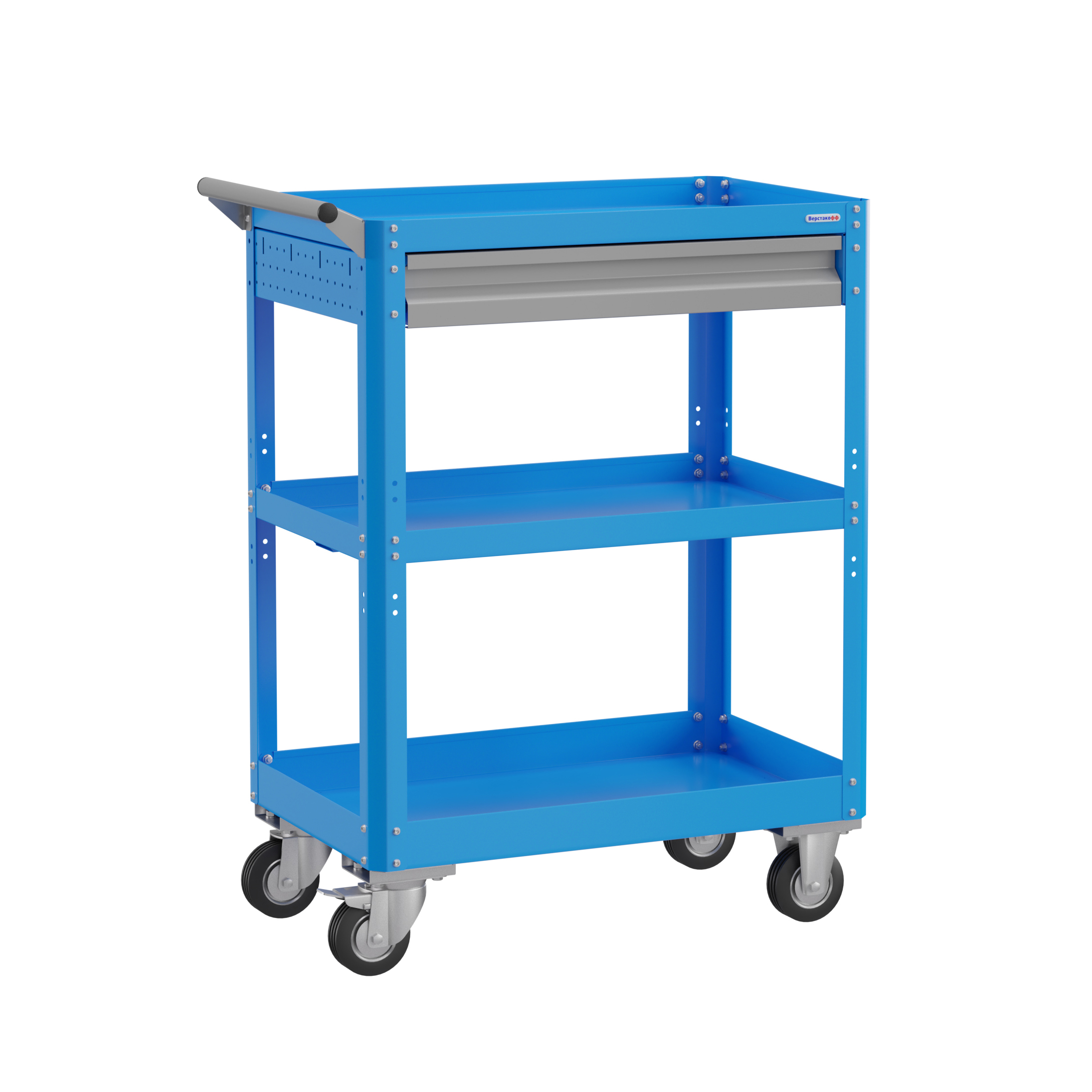 Размер 950х700х450мм. С выдвижным ящиком на шариковых телескопических направляющих. Общая равномерно-распределённая нагрузка на тележку - до 100кг. Корпус выполнен из листовой стали толщиной от 0,6 до 1,5мм., покрыт полимерной порошковой краской. Верхняя и средняя полка имеют высоту борта 40мм., нижняя полка имеет высоту борта 60мм