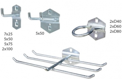 Универсальный набор крючков для любых перфорированных панелей с перфорацией 10х10 мм. Установка при помощи зацепов повышает удобство пользования держателями, монтажа и расширяет возможности формирования необходимой рабочей зоны на панели. Форма крюков (толщина 6 мм) и геометрия стального основания многообразны, что позволяет удерживать инструмент различных габаритов и весовых характеристик.