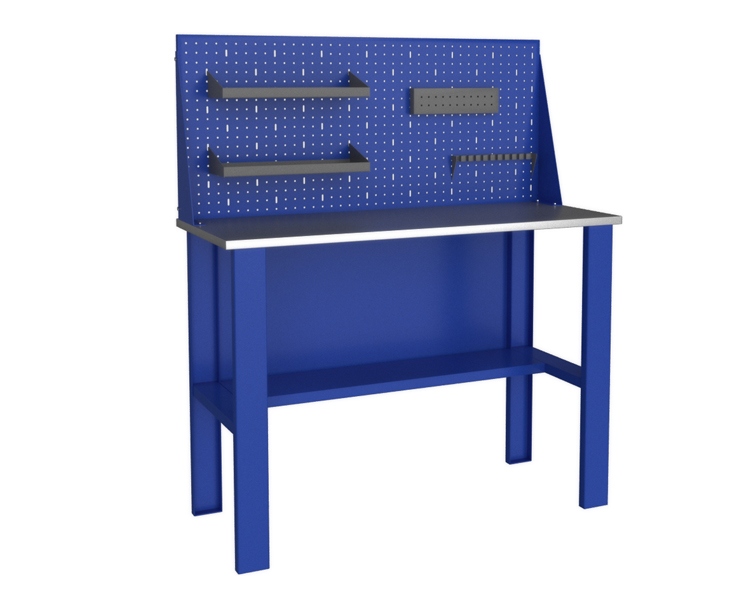Конструкция отличается устойчивостью, стоит на двух опорах – они изготовлены из прочного листового металла. Для удобства работы имеется экран, на который устанавливаются навески, а также полка внизу. Наличие тумб не предусмотрено.