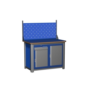 870х1200х700 мм. со столешницей (фанера 24 мм. + 6 мм. сталь). Сборно-разборный каркас. Включает в себя: модуль с дверцей и одним выдвижным ящиком, модуль с дверцей.