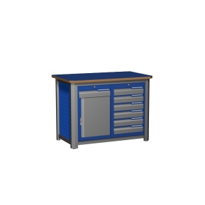870х1200х700 мм. со столешницей (фанера 24 мм. + 6 мм. сталь). Сборно-разборный каркас. Включает в себя: модуль с дверцей и одним выдвижным ящиком, модуль с дверцей и 6-ю выдвижными ящиками.