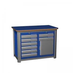 Основу изделия составляют две смежные тумбы, обрамленные на всех гранях толстостенными металлическими уголками, что придает конструкции устойчивости и создает запас прочности. Верстак оснащен одним ящиком с дверцей и несколькими выдвижными ящиками. Удобная эргономика дверцы и наружной фурнитуры.