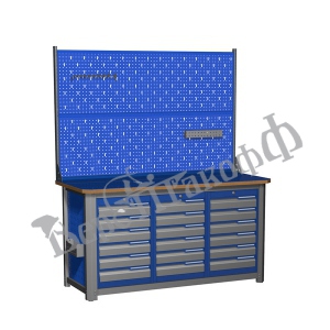 Верстаки применяются в производственных цехах, автосервисах. Это изделие оснащено тремя тумбами с 6 выдвижными ящиками для удобного хранения инструментов, расходных материалов, документов. В комплектацию не входит экран и открытые полки.