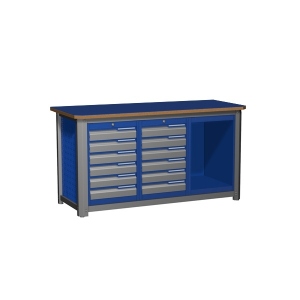 870х1500х700 мм. со столешницей (фанера 24 мм. + 6 мм. сталь). Сборно-разборный каркас. Включает в себя: два модуля с 6-ю выдвижными ящиками, полку-стенку большую.