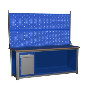 870х2000х700 мм. со столешницей (фанера 24 мм. + 6 мм. сталь). Сборно-разборный каркас. Включает в себя: модуль с дверцей и одним выдвижным ящиком, 3 полки-стенки большие.
