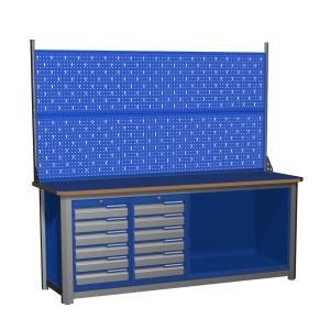 870х2000х700 мм. со столешницей (фанера 24 мм. + 6 мм. сталь). Сборно-разборный каркас. Включает в себя: два модуля с 6-ю выдвижными ящиками, 2-е полки-стенки большие.
