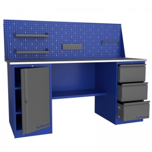 1 тумба - 3 ящика, 1 тумба с дверью (2 полки), замки, полка, экран с комплектом навесок, оцинк. столешница h=24 мм (фанера+оцинкованный металл 1мм).