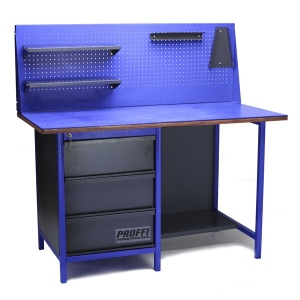 Верстаки серии «PROFFI» предназначены для установки в производственных помещениях и собираются в различной комплектации из отдельных элементов: ; PROFFI опора - синего цвета;  PROFFI ножка - синего цвета;  PROFFI столешница 1 Д (2Д, 3Д) из 24 мм фанеры, обработаны защитным лакокрасочным покрытием; PROFFI столешница 1М (2М, 3М) из стального листа 6 мм; возможны варианты установки комбинированных PROFFI столешниц (фанера 24 мм + металл 6 мм) и PROFFI столешниц ( фанера 24 мм + металлическая накладка 2 мм);  PROFFI тумба с дверцей - все элементы серого цвета; PROFFI тумба с ящиками, все элементы серого цвета; PROFFI полка/стенка 1 (2), серого цвета; ВСС экран 2 (3) синего цвета, с комплектом навесок серого цвета (полка - 2 шт., держатель отверток - 1 шт., держатель ключей - 1 шт.). В комплектацию ящиков входит пластиковая ручка.