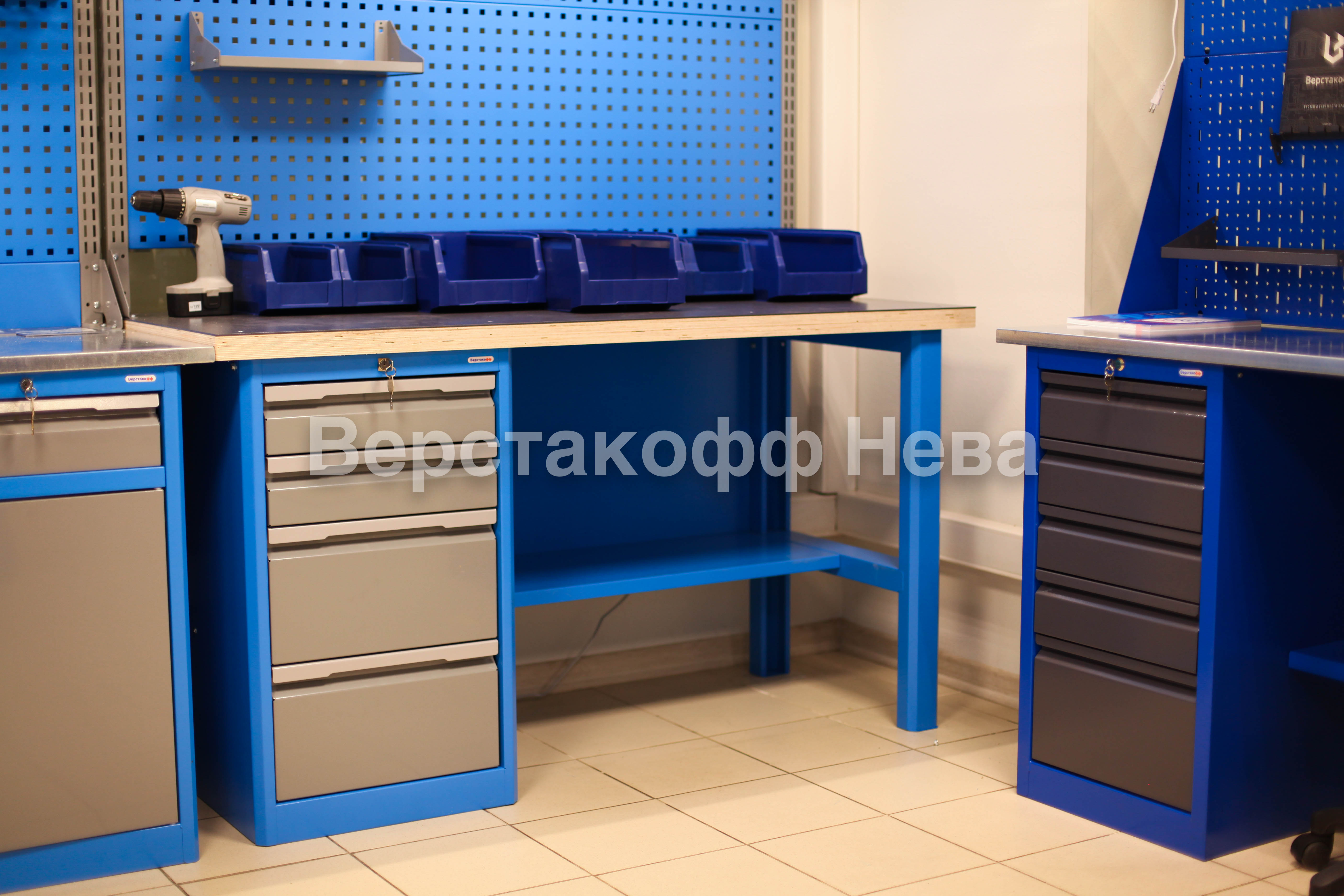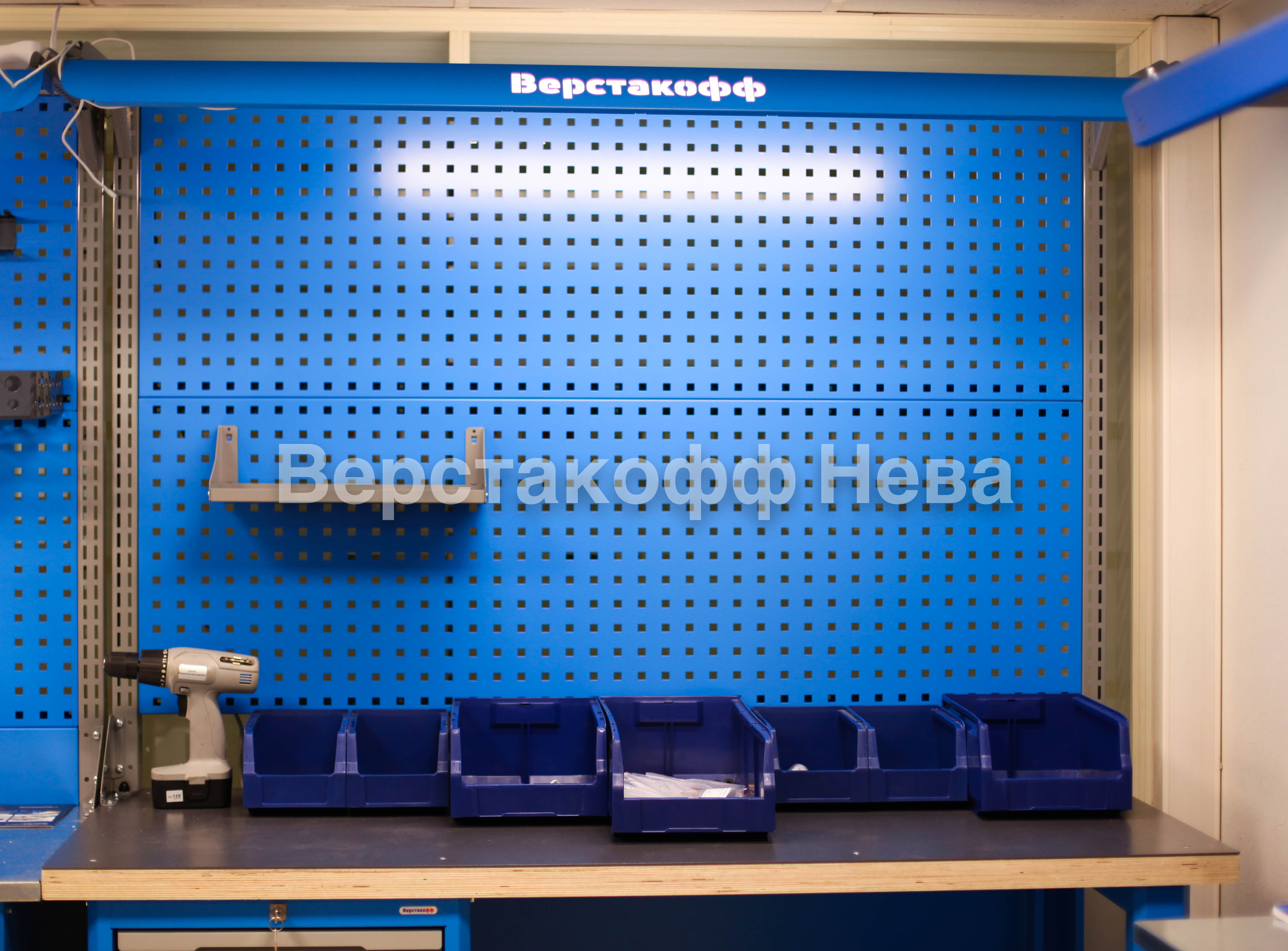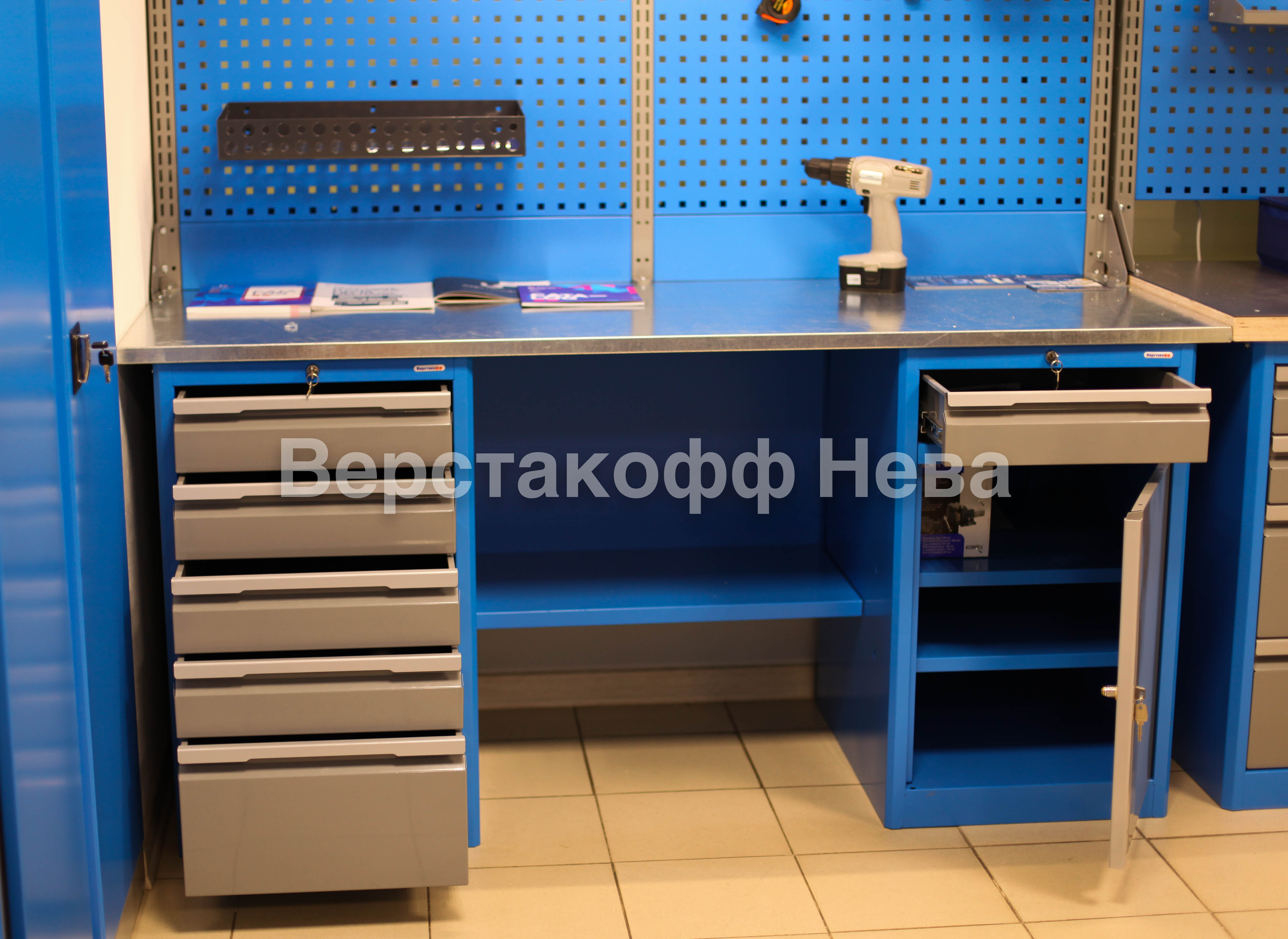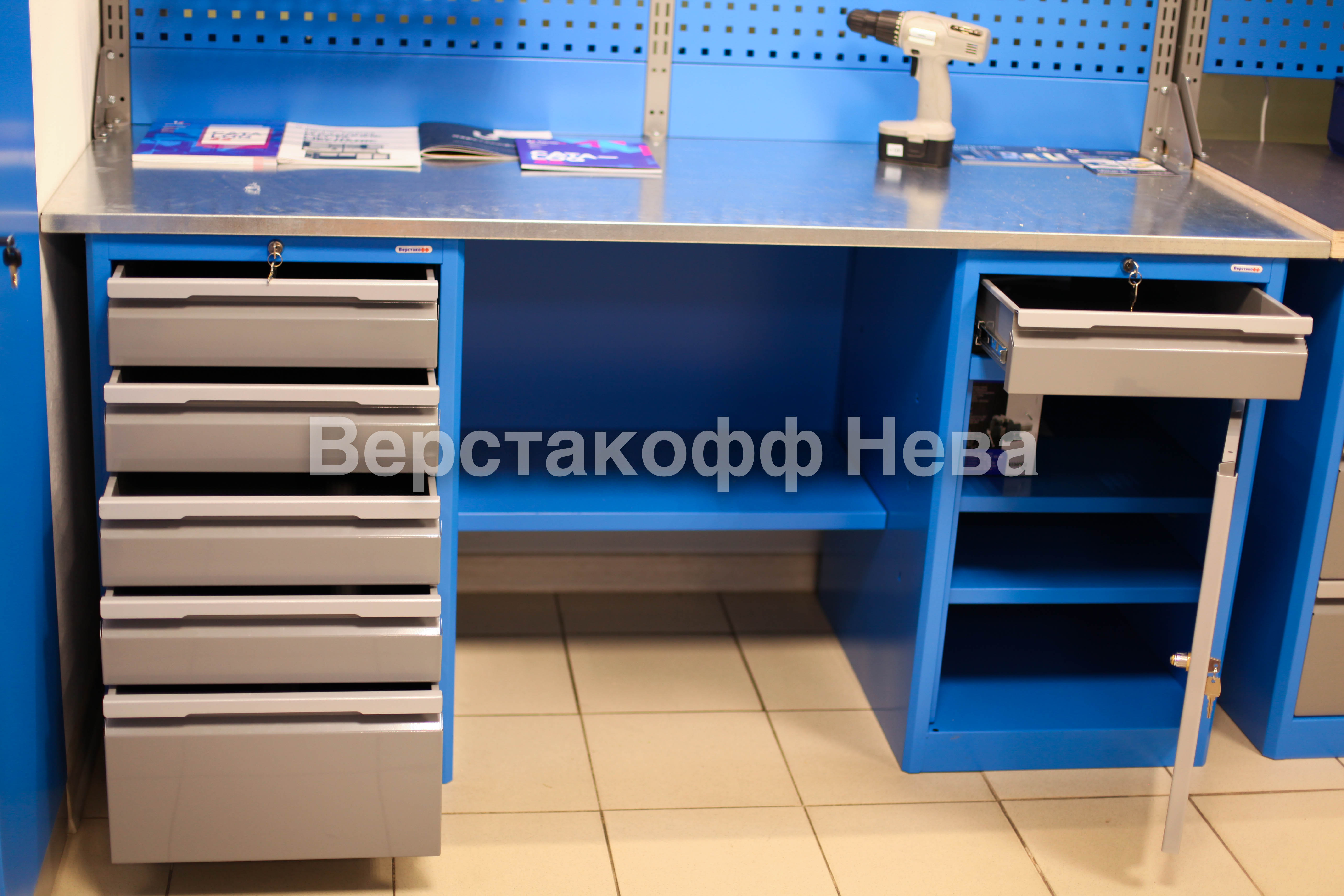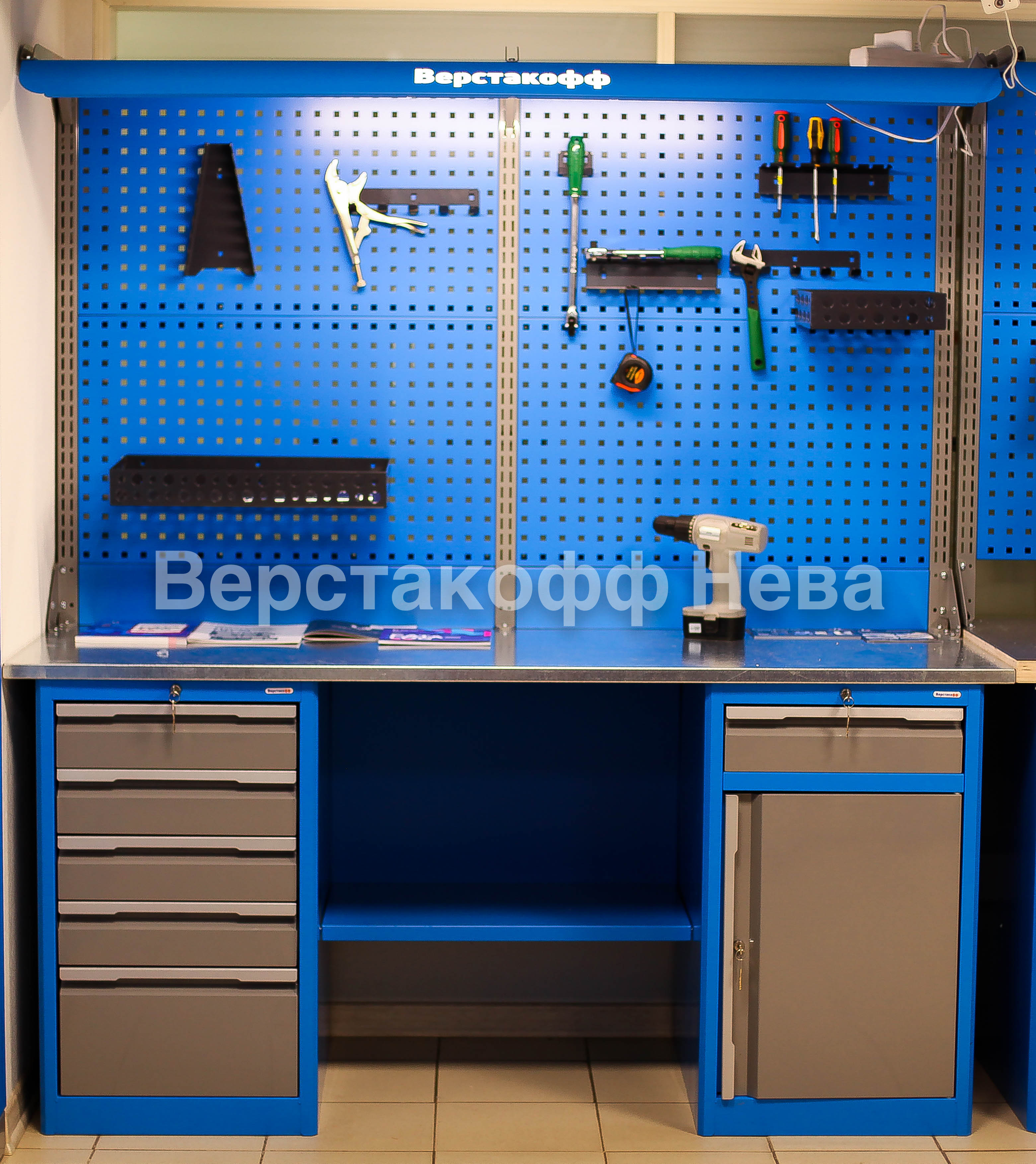 Состоит из PROFFI столешницы (фанера), PROFFI Столешница(сталь 6мм)nbsp;PROFFI опоры, с большим экраном и подсветкой,PROFFI полкистенки 1, PROFFI Тумбы с дверцей. Верстаки серии «PROFFI» предназначены для установки в производственных помещениях и собираются в различной комплектации из отдельных элементов:nbsp; PROFFI опора - синего цвета;nbsp; PROFFI ножка синего цвета; PROFFI столешница 1 Д (2Д, 3Д) из 24 мм фанеры, обработаны защитным лакокрасочным покрытием; PROFFI столешница 1М (2М, 3М) из стального листа 6 мм; возможны варианты установки комбинированных PROFFI столешниц (фанера 24 мм + металл 6 мм) и PROFFI столешниц ( фанера 24 мм + металлическая накладка 2 мм); PROFFI тумба с дверцей - все элементы серого цвета; PROFFI тумба с ящиками, все элементы серого цвета; PROFFI полка/стенка 1 (2), серого цвета;nbsp; ВСС экран 2 (3) синего цвета, с комплектом навесок серого цвета (полка - 2 шт., держатель отверток - 1 шт., держатель ключей - 1 шт.). В комплектацию ящиков входит пластиковая ручка. Сверху экрана установлена подсветка на магнитных креплениях для легкого монтажа.